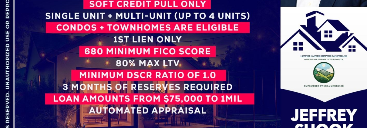 DSCR LOAN - Jeffrey Shook -Residential Mortgage Loan OriginatorHi, my name is Jeffrey Shook. I’m a Loan Officer with NEXA Mortgage LLC., offering personalized mortgage solutions, fast customized quotes, great rates and service with integrity.
